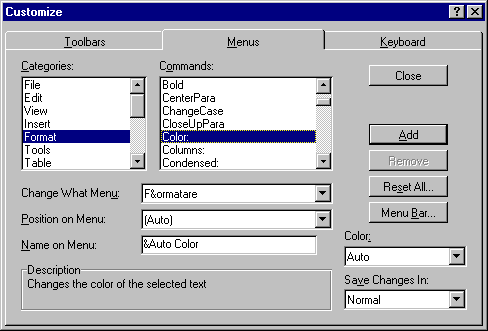 Selectând Tools-Customize, Word va afisa caseta de dialog Customize. Executati un clic pe eticheta Keyboard ca sa o aduceti pe prima pagina a casetei de di 555j91f alog. Din lista Categories, selectati comanda dorita. Acum puteti sa stabiliti o combinatie de taste pentru aceasta comanda, sa stergeti o combinatie de taste sau chiar sa stergeti toate combinatiile de taste din model.