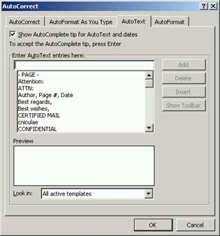 Ca si AutoCorrect AutoText iti permite sa economisesti timp, ajutandu-te sa introduci automat cuvinte sau expresii lungi, folosite frecvent. Spre deosebire de AutoCorrect, care de fiecare data inlocuieste automat abrevierea cu textul propriu-zis, AutoText memoreaza textul si ofera posibilitatea de a insera sau nu textul, dupa necesitati. Elementul poate fi adaugat intr-un anumit model sau in toate modelele deschise la momentul respectiv.