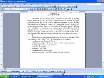 Procesorul de documente Word face parte din pachetul de aplicatii Office, dezvoltat de firma Microsoft, pentru sistemul de operare Windows. Aceasta aplicatie are, pe de o parte, trasaturile generale ale unei aplicatii Windows si, pe de alta parte, trasaturi care o particularizeaza, trasaturi legate de functiile ei specifice. Ca pentru orice aplicatie Wind 151d32b ows, si pentru aplicatia Word interfata cu utilizatorul este realizata prin intermediul ferestrei de aplicatie. Fiecare document cu care se lucreaza, la un moment dat, sub controlul aplicatiei Word, are atasata o fereastra document, Word fiind o aplicatie care poate gestiona, la un moment dat, mai multe ferestre document.