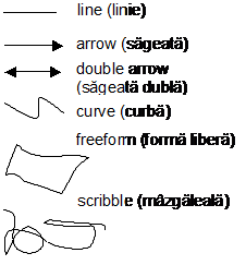 Nota. Executa dublu clic pe butonul de linie sau de forma geometrica pentru a-l bloca. Ulterior, poti desena mai multe obiecte fara a mai selecta forma respectiva. Pentru a-l debloca executa clic pe acelasi buton.