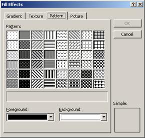 n Pattern (Model). Poti selecta unul din cele 42 de modele in culori si poti alege o culoare de prim plan si una de fundal pentru model. Observa fereastra Sample (Esantion) ca sa fi sigur ca ai ales culori complemetare.