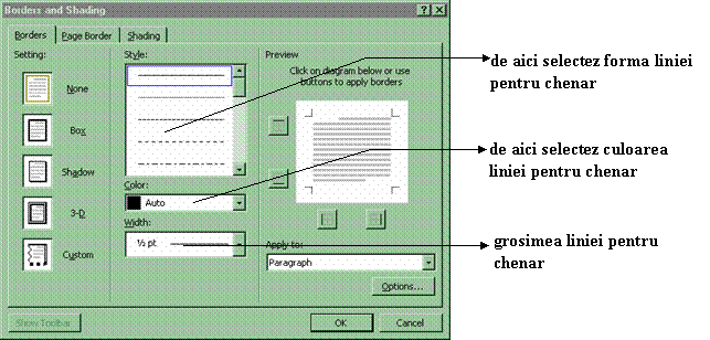 Pentru a lucra cu chenare putem folosi bara Tables and Borders, sau putem merge in meniul Format la comanda Borders and Shading, eticheta Borders.