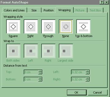 mergeti in meniul Format la ultima comanda de aici, care se modifica in functie de natura obiectului selectat, la eticheta Wrapping de unde puteti modifica modul in care textul "invaluie" obiectele desenate sau inserate