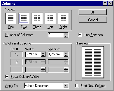 Pentru crearea unui document scris pe mai multe coloane, puteti sa transformati textul existent în coloane sau sa creati mai întâi coloanele si apoi sa introduceti textul 454f57e în acestea. Pentru transformarea textului existent în coloane, selectati-l. Selectati Format-Columns pentru a afisa caseta de dialog Columns. Alegeti numarul de coloane executând un clic pe unul dintre butoanele prestabilite sau introducând un numar în caseta Number of Columns.