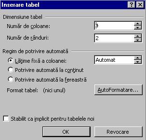 Se stabileste numarul de coloane si de linii ale tabelului. De asemenea, poate fi stabilita o latime fixa a coloanei sau se poate realiza potrivirea automata a coloanei la continut.