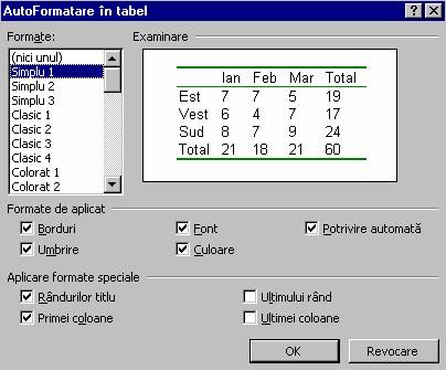 Apasarea butonului AutoFormatare va deschide fereastra AutoFormatare în tabel care permite alegerea unui tip de tabel.