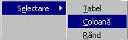 Optiunea Tabel are ca efect selectarea întregului tabel, optiunea Coloana va selecta coloana curenta, iar optiunea Rând va determina selectarea rândului curent.