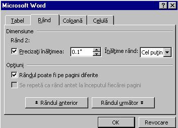 Pagina Rând asigura redimensionarea rândurilor. Astfel, cu ajutorul butoanelor Rândul anterior si Rândul urmator, se pot parcurge toate liniile si se poate specifica înaltimea pentru fiecare.
