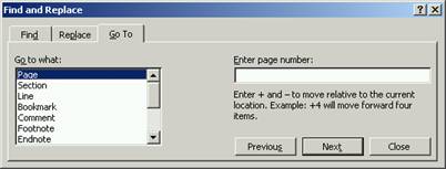 Comanda Go To iti permite sa te deplasezi intr-un loc in cadrul unui document mult mai rapid decat prin deru 414d39e larea cu ajutorul barelor de derulare sau a tastaturii. Aceasta comanda poate localiza diverse elemente care intra in componenta unui document. Executarea comenzii are ca efect afisarea casetei de dialog Find and Replace care este prezentata in imaginea urmatoare.