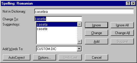 Programul de verificare a ortografiei este un instrument foarte util atunci când vreti sa va asigurati ca documentul dumneavoastra nu contine greseli suparatoare. Pentru lansarea procedurii de verificare a ortografiei 212b19c selectati Tools-Spelling sau executati un clic pe butonul Spelling de pe bara cu instrumente de lucru standard. Daca nu gaseste nici un cuvânt necunoscut, Word afiseaza un mesaj care spune ca verificarea s-a terminat: Daca gaseste un cuvânt necunoscut, Word afiseaza caseta de dialog Spelling. În caseta Not in Dictionary este afisat cuvântul gasit. În caseta Change To puteti vedea rezultatul celei mai bune încercari facute de Word de a ghici ce cuvânt ati vrut sa scrieti. În caseta Suggestions sunt date alte cuvinte pe care Word le considera apropriate de ceea ce ati scris dumneavoastra. Acum executati un clic pe butonul Change pentru a înlocui cuvântul din caseta Not in Dictionary cu cuvântul din caseta Change To sau cu alt cuvânt din caseta Suggestions. Daca nu vreti sa înlocuiti cuvântul, executati clic pe butonul Ignore.