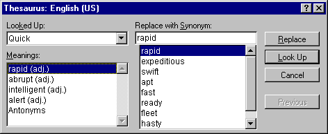 Pentru folosirea dictionarului de sinonime selectati cuvântul sau expresia pe care vreti sa le cautati (sau mutati punctul de inserare în cadrul cuvântului). Selectati Tools-Thesaurus. Va fi afisata caseta de dialog Thesaurus, continând cuvântul selectat în rubrica Looked Up.