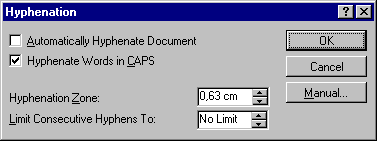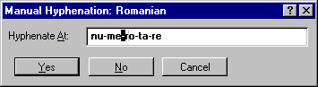 Pentru despartirea în silabe a cuvintelor de la sfârsitul rândurilor dintr-un document sau dintr-un bloc de text selectat, selectati Tools-Hyphenation pentru a afisa caseta de dialog Hyphenation. Pentru despartirea automata în silabe, validati caseta Automatically Hyphenate Document. Pentru despartirea manuala, executati un clic pe butonul Manual. Atunci când Word gaseste în zona de despartire un cuvânt pe care îl poate desparti în silabe, activeaza caseta de dialog Manual Hyphenation, în care este afisata despartirea în silabe propusa de Word.