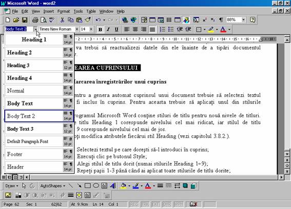 Nota: Daca lucrati cu stiluri in formatarea documentului folositi de la inceput stilurile Heading pentru titluri si astfel aveti marcat textul pentru cuprins.