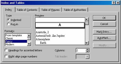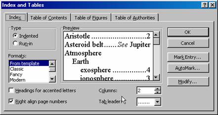Pasul 2: Alegi comanda Index and Tables (Inserare Index si