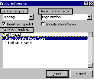 n Lista Insert reference to (Inserare referinta la) îti da posibilitatea sa specifici ce informatie doresti sa fie afisata în referinta. Poti afisa o referinta la textul titlului (Heading text), la un numar de pagina (Page number), la numarul unui articol dintr-o lista, etc.