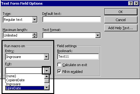 Ai posibilitatea sa indici din lista continuta īn dreptul casetelor Entry: (respectiv Exit:) numele macrocomenzii care sa ruleze īn momentul īn care punctul de inserare a ajuns la īnceputul (respectiv la parasirea) cāmpului selectat.
