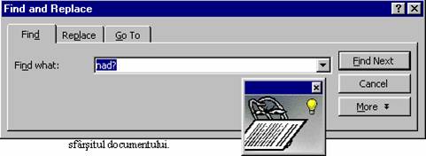 Daca nu mai vreti o parcurgere pas cu pas a documentului, actionati butonul Replace All. Toate ocurentele de la pozitia curenta p na la sf rsitul documentului vor fi înlocuite cu noul text.