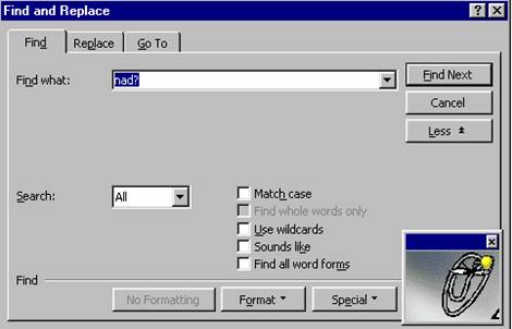 Acest câmp face parte dintr-o lista ascunsa în care sunt înregistrate toate textele cautate în sesiunea curenta de lucru. Daca mai faceti o operatie de cautare a aceluiasi fragment de text, puteti sa-l alegeti din lista ascunsa Find what, evitând astfel introducerea repetata a lui. Actionati apoi butonul Find Next pentru a cauta prima aparitie a textului introdus în Find what. Prin actionarea repetata a butonului Find what, gasiti urmatoarele aparitii ale acestui text.