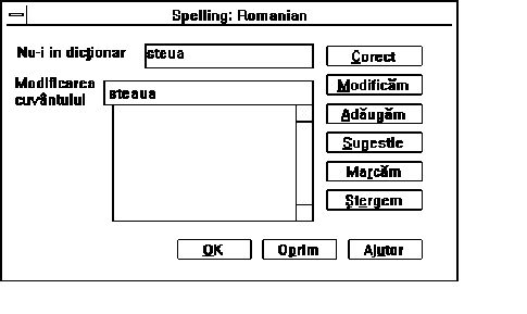 "OK'' Activarea acestui buton determina finisarea procesului de corectare a cuvântului, de substituire a cuvântului depistat prin cel potrivit, furnizat de sugestie, sau de marcare a cuvântului.