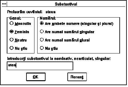 cazul nominativ, numarul singular, forma nearticulata (sau plural, daca ati indicat ca are numai numarul plural). Efectuând corectarea cuvântului-lema (daca este necesara), activati butonul "OK''. Un exemplu de completare a boxei de dialog cu specificarea genului si numarului substantivului "stea" si determinarea cuvântului-lema este prezentat în Figura 13.