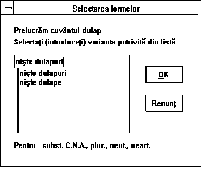 Sunteti invitati sa selectati varianta potrivita din cele propuse sau sa adaugati una noua. Unele din aceste cuvinte (variante) pot fi destul de stranii, dar anume aceasta situatie faciliteaza procesul de selectare a variantei potrivite. De exemplu, daca aveti de flexionat cuvântul "dulap'' procedura respectiva va sugereaza variantele specifice pentru substantivul neutru, numarul plural, cazul nominativ, forma nearticulata: ''dulap+ uri'', ''dulap + e'' (vezi Figura 14).