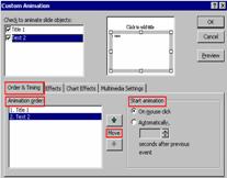 Daca nici unul din efectele acestea nu corespunde nevoilor tale, ai posibilitatea sa creezi alte efecte astfel: executi clic pe butonul Custom Animation si selectezi eticheta Order & Timing pentru a vedea urmatoarele optiuni:
