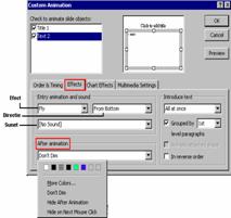 Eticheta Effects iti permite sa alegi modul de defilare al obiectelor, directia de defilare si ce sunete sa le fie asociate. Caseta de editare After animation iti ofera posibilitatea sa inactivezi sau sa ascunzi marcajele care au fost prezentate, atragand astfel atentia auditoriului asupra urmatoarei idei pe care o expui.