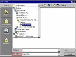 Pentru aceasta trebuie sa executi clic pe butonul Custom Animation, iar in fereastra Custom Animation apesi butonul Effects. Din lista derulanta Sound selectezi Other Sounds, ceea ce va avea ca efect deschiderea ferestrei Add Sound. Selectezi numele fisierului de sunet si apesi butonul OK. Numele lui va fi trecut in lista sunetelor, pentru o apelare ulterioara.