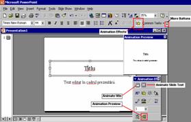 Pentru a anima titlul prezentarii executi clic pe butonul Animate title din bara Animation Effects, alegi una din optiunile de animare executand clic pe ea si apoi apesi butonul Animation Preview pentru a vedea in fereastra Animation Preview efectul respectiv. Fiecare buton are propriile lui efecte sonore si de animatie. Cand aplici aceste efecte unor zone sau unor obiecte, ele primesc un numar in caseta de editare de pe bara cu instrumente Animation Effects. Poti schimba ordinea lor prin schimbarea numarului. De exemplu poti selecta zona pentru obiecte si sa-i dai numarul 1 in caseta de editare a numarului, apoi selectezi zona de titlu si-i dai numarul 2. In acest fel animatia aplicata zonei pentru obiecte va fi primul efect aplicat, urmat de efectul aplicat pentru zona de titlu.