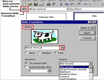 In modul de vizualizare Slide Sorter poti selecta si activa bara de instrumente Slide Sorter. Acest lucru il faci din meniul View, Toolbars, Slide Sorter In partea stanga a acestei bare se afla butonul Slide Transition. Daca executi un clic pe acest buton se va deschide caseta Slide Transition Effects. Cu ajutorul butonului de derulare poti vedea si alege mai multe tipuri de efecte de tranzitie, iar cu ajutorul butoanelor radio de pe randul urmator poti stabili viteza cu care se desfasoara tranzitia. Efectele selectiei le vezi in zona de previzualizare, in partea de sus a casetei. Ai posibilitatea sa alegi sunetul care insoteste tranzitia din lista de optiuni aflata in sectiunea Sound, ceea ce va mari impactul asupra auditoriului. In sectiunea Advence bifezi caseta On mouse clic daca vrei ca trecerea de la un slide la altul sa se faca numai in momentul in care executi clic pe butonul stang au mouse-ului, sau bifezi caseta Automaticaly after si editezi numarul de secunde dupa care vrei sa se produca automat tranzitia (te poti folosi de butoanele de crestere si descrestere din partea dreapta a casetei de editare). Bifarea ambelor casete din sectiunea Advence va avea ca efect combinarea celor doua optiuni astfel: tranzitia se efectueaza la apasarea butonului mouse-ului sau automat dupa numarul specificat de secunde.