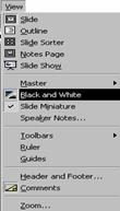 In momentul in care iti creezi o prezentare folosesti slide-uri care au diferite culori ca fundal sau ai formatat zone din text pentru a le evidentia. Daca doresti sa tiparesti prezentarea cu ajutorul unei imprimante obisnuite, in alb-negru, sau vei face prezentarea pe folii transparente alb-negru, sigur vei vrea sa vezi cum va arata lucrarea ta in acele nuante, pentru a face eventual retusuri pentru diferite evidentieri. Acest lucru il obtii cu ajutorul meniului View, selectand Black and White. (Si pe bara cu instrumente standard vei gasi butonul corespondent acestei comenzi.) In acest moment pe ecran vei vedea slide-ul curent afisat in alb si negru, eventual si cu nuante de gri, in functie de culorile lui. Pentru a avea si o mica imagine a slide-ului in culori selecteaza Slide Miniature din meniul View, daca nu apare automat mini-slide-ul. Astfel poti sa te orientezi usor pentru eventuale schimbari.