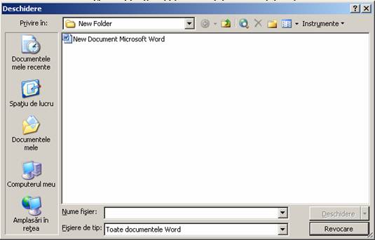 Din aceasta fereastra putem alege de unde anume sa deschidem documentul (e.g. din Documentele mele (My Documents), sau de pe oricare din partitiile calculatorului (A:, C:, etc.).