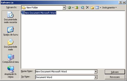 La fel ca si īn cazul deschiderii unui document, se va specifica locul unde se va salva respectivul document, precum si numele (īn mod standard, aplicatia WORD īncearca sa ne ajute sugerāndu-ne un nume din ceea ce am scris deja īn document; de exemplu ne poate sugera ca si nume titlul documentului).