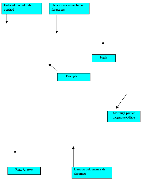 Fereastra caracteristica aplicatiei Word este prezenta in Fig. 3.1. Fereastra poate apare putin diferit deoarece aplicatia permite utilizatorilor sa o personalizeze dupa preferinta si nevoile fiecaruia. Fereastra contine multe elemente deja familiale prin absolvirea modulului "Gestionarea interfetei cu utilizatorul": bara de titlu, butoanele de minimizare, restaurare si inchidere a aplicatiei, bara cu meniuri, bara cu unelte de lucru standard, bara de stare si barele pentru derulare paginilor.