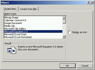 n Selecteaza comanda Object… din meniul Insert. Pe ecran va fi afisata caseta de dialog Object, iar din lista Object type: selectezi valoarea Microsoft Equation 3.0, apoi apesi butonul OK