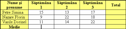 Sa lucram pe un exemplu pornind de la un tabel completat cu date. Pe ultimul rānd vom calcula media valorilor pe fiecare coloana, apoi vom face pe coloana Total suma valorilor pentru fiecare persoana (pe fiecare rānd) si suma totala (pe coloana).