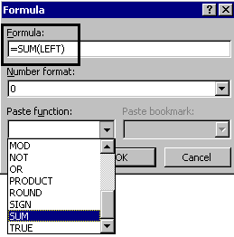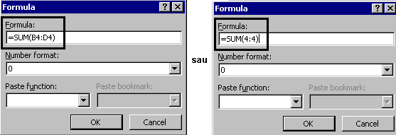 n Din caseta Paste function: alege SUM. Aceasta functie este inserata īn caseta Formula:.Punctul de inserare clipeste īntre cele doua paranteze.