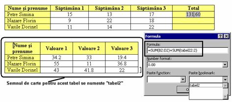 Īn exemplul dat anterior punctul de inserare a fost plasat pe primul rānd al primului tabel, īn coloana Total. Scriem formula care sa adune valorile primului rānd din tabelul principal (de la Saptamāna 1 pāna la Saptamāna 3) (SUM(B2:D2)) cu valorile aflate pe primul rānd al tabelului al doilea, caruia i-am atribuit ca nume de semn de carte "tabel2" (SUM(tabel2 2:2)). Formula va fi: