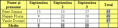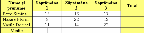 Sa lucram pe un exemplu pornind de la un tabel completat cu date. Pe ultimul rand vom calcula media valorilor pe fiecare coloana, apoi vom face pe coloana Total suma valorilor pentru fiecare persoana (pe fiecare rand) si suma totala (pe coloana).