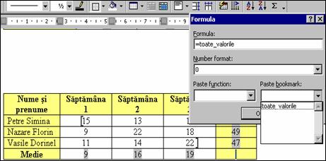 n Parcurgi secventa Table => Formula. In caseta Formula: este sugerata o formula.