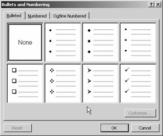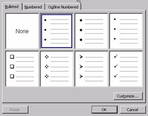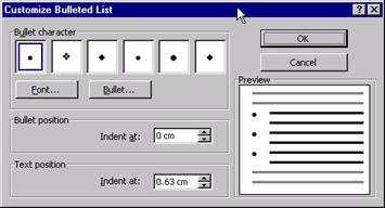 Butonul Customize in cazul acestei etichete ne conduce la caseta Customize Bulleted List.