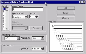 Formatul numarului (in imagine 1.1…) este functie de nivelul de indentare. Nivelul de indentare poate sa creasca pana la 9. De asemenea din zona Number format se pot seta: stilul numarului (1,2,3; a,b,c; I,II,III etc.), de la ce numar sa inceapa lista (in imagine, aceasta incepe de la 1), fontul.