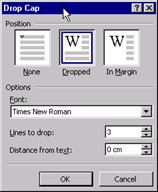 Dropped, litera “cazuta”; acesteia i se poate seta fontul, numarul de linii “de cadere” si distanta pana la text;