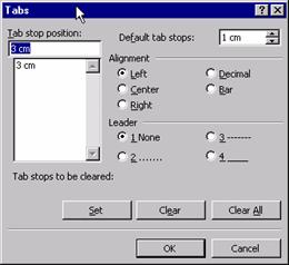 In caseta “Tab stop position” se scriu valorile tabulatorilor respectivi. In imagine este setat un tab aliniat stanga la 3 cm.