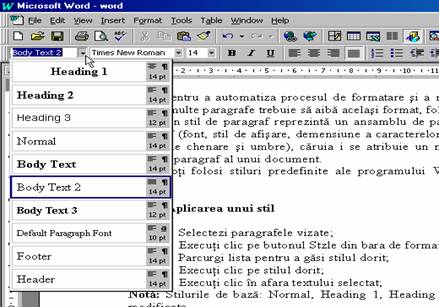 Din lista Style for following paragraph poti stabili ce stil va avea paragraful ulterior;