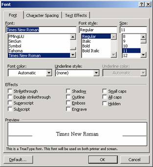 Fisa Font a casetei de dialog Font iti permite sa stabilesti sau sa modifici fontul, aspectul exterior, dimensiunea fontului, tipul de subliniere, culoarea, precum si anumite efecte speciale. Aceasta fisa contine urmatoarele atribute: