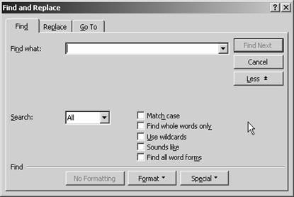 daca activati Use wielcards este posibila cautarea unor caractere speciale, sau se pot preciza filtre sau operatori de cautare. Acestea însa vor fi tratate ca text daca optiunea nu este inactiva. Pentru a insera astfel de caractere se face clic pe butonul Special care este activa doar daca optiunea Find whole words only este dezactivata si puteti alege orice doriti dintr-o lista care se deschide. În momentul în care se face clic pe una din optiunile liste, în fereastra rubricii Find what va apare o valoare corespunzatoare acelei optiuni.