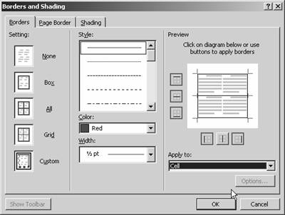 în rubrica Setting alegeti tipul de vizualizare a liniilor de pe contul celulelor între None, Box, All, Grid, Custom;