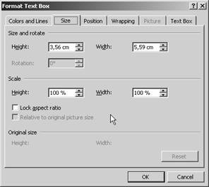 În Size and Rotate stabiliti înaltimea (Heigh) si latimea (Width) casetei;