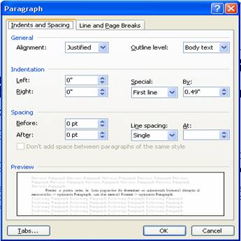 Zona Indentation: permite indentarea unui paragraf selectat fata de cele doua margini: Left sau Right. Indentarrea se poate face in inch sau centimetri. Schimbarea intre cele doua unitati de masura se face din meniul Tools -> optiunea Options -> pagina General -> zona Measurement Units.